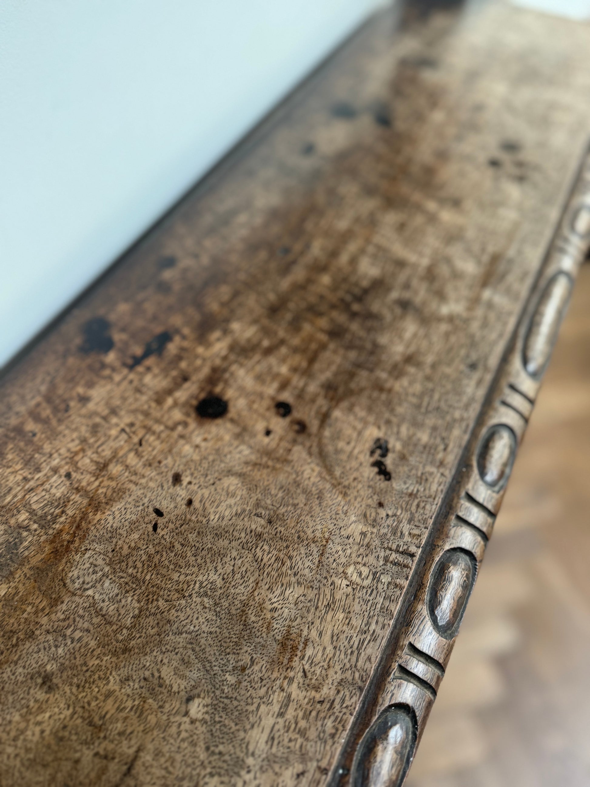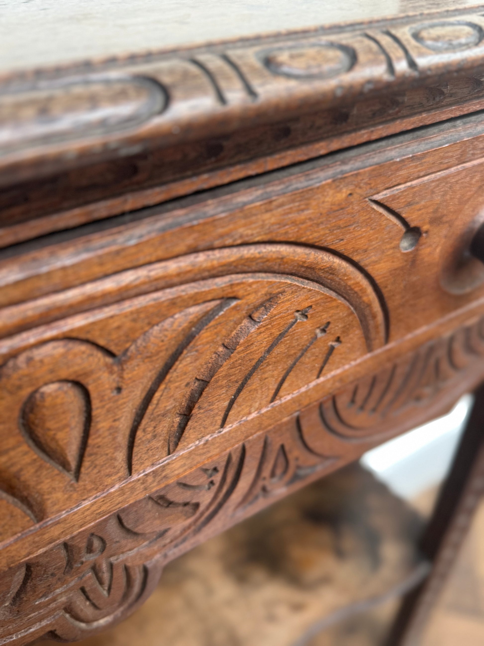 This beautifully carved 19th century slim oak dresser was bought in France but I suspect it could be English, although I'm no expert in this field or any field come to think of it! Anyway I bought it because I love it and it's unusual.