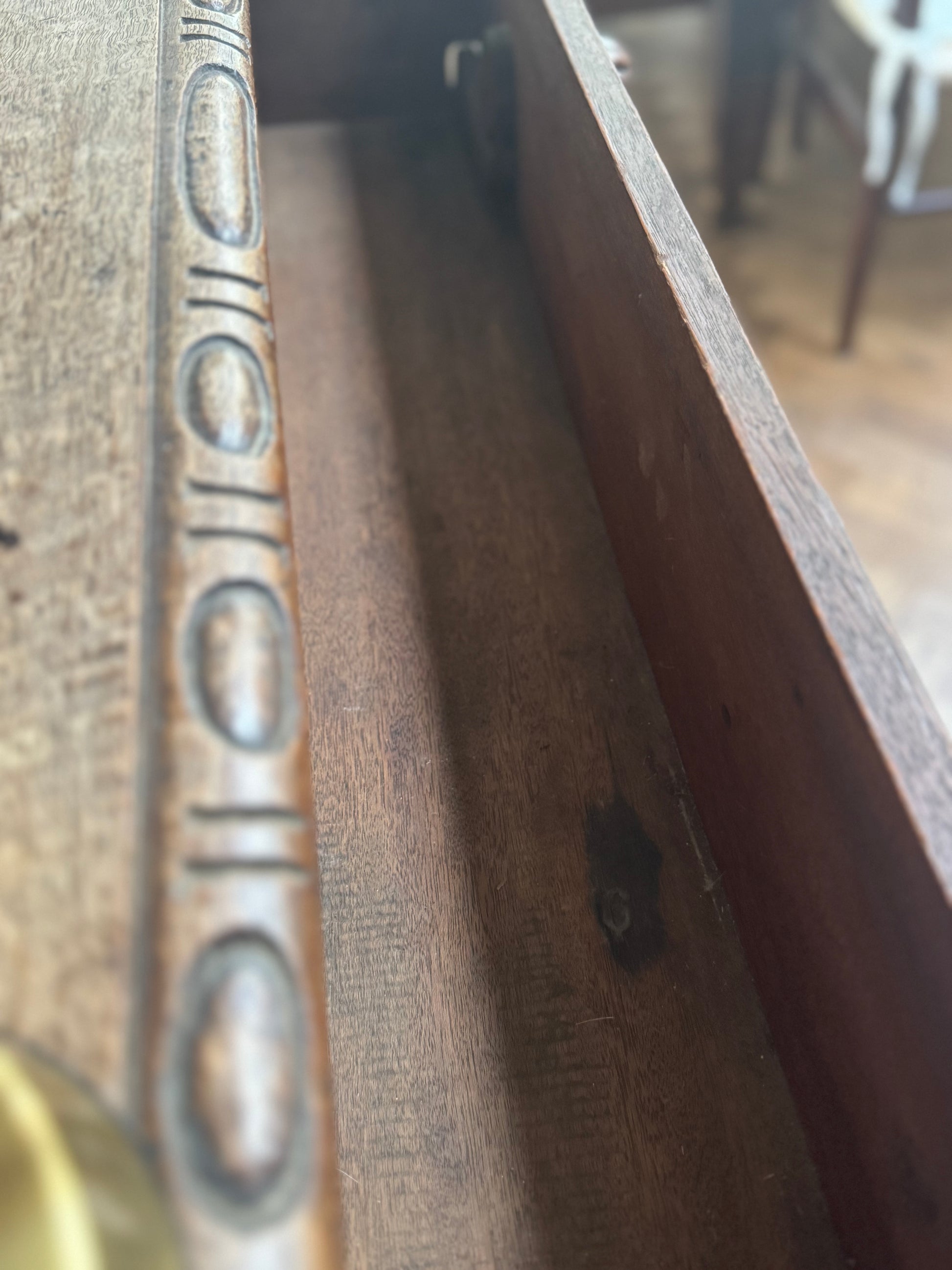 It's proportionally very narrow and slim, making it perfect for smaller houses or tricky spaces. it has lovely carving to the surfaces and beautiful tactile carved drawer knobs. Lovely patina on the shelves of the bottom section and this dressers holds a little secret, the drawer secretly locks by turning the right hand handle.