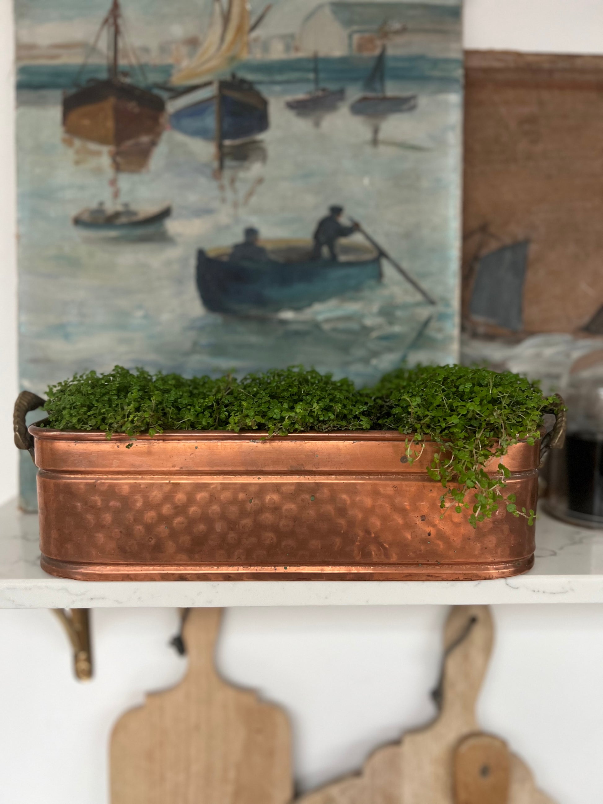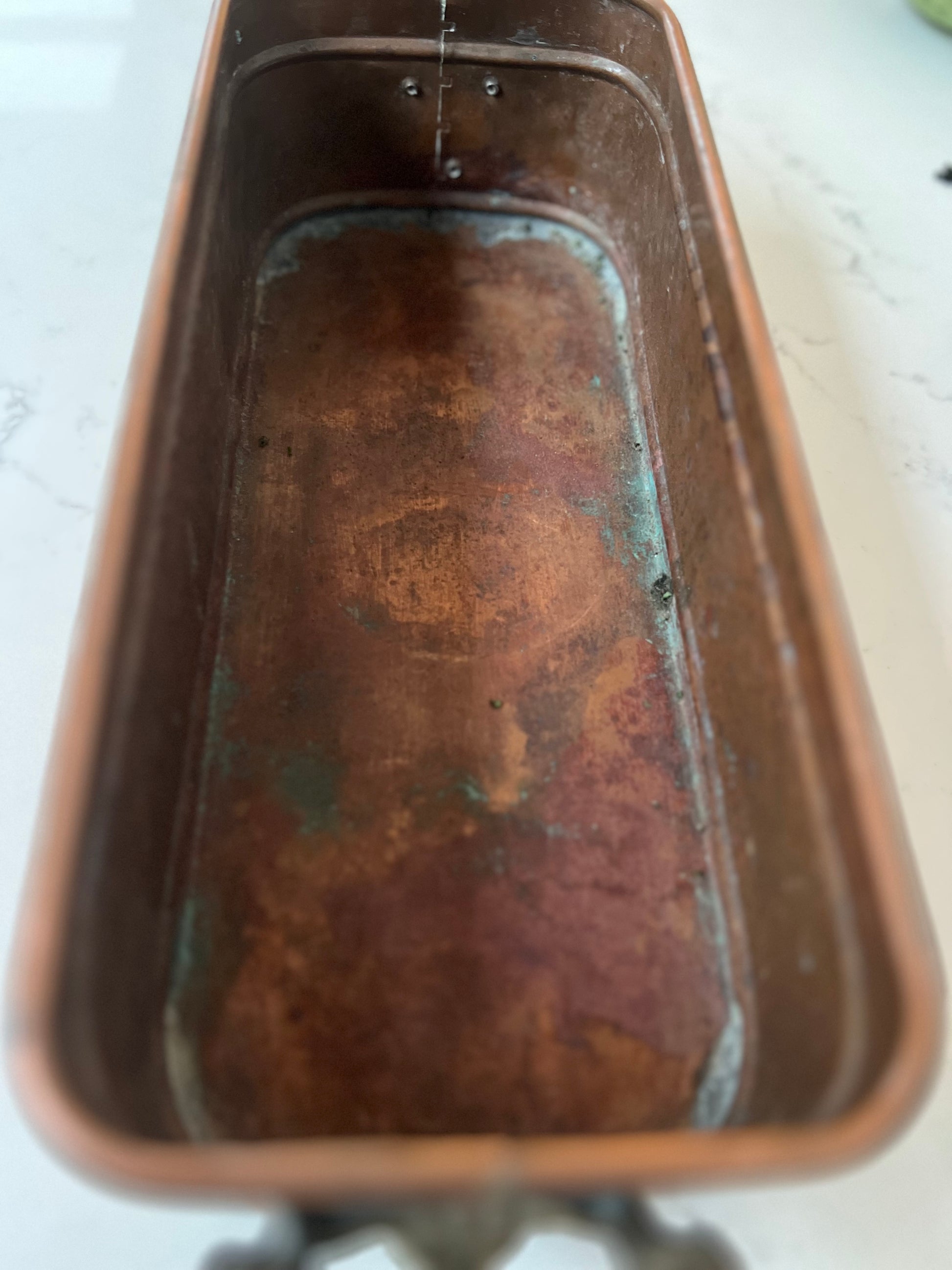 A delightful classic copper planter with brass lions head handles. Perfect for bulbs or a Christmas table stuffed with moss and candles. Cant vouch for it being watertight.