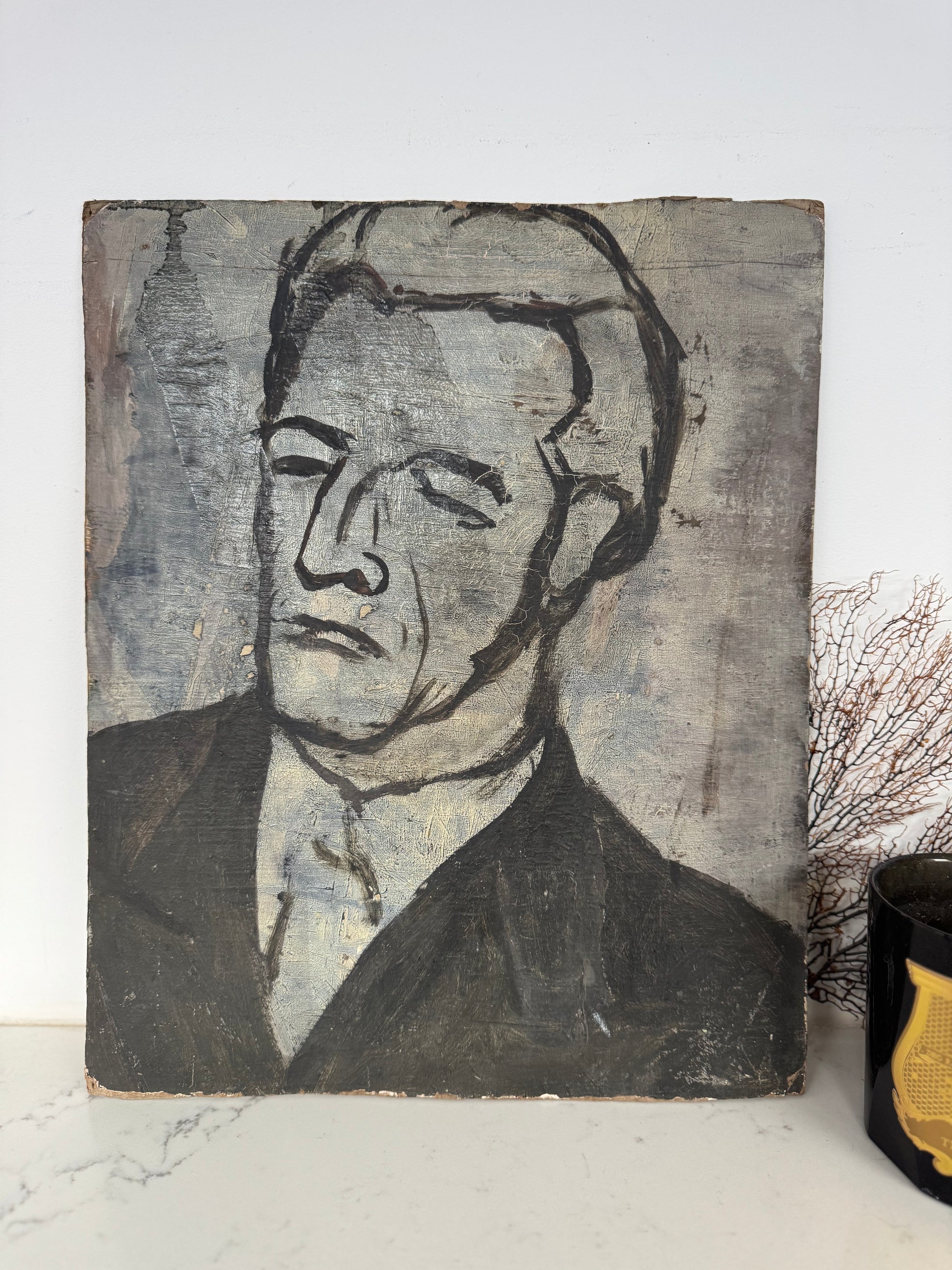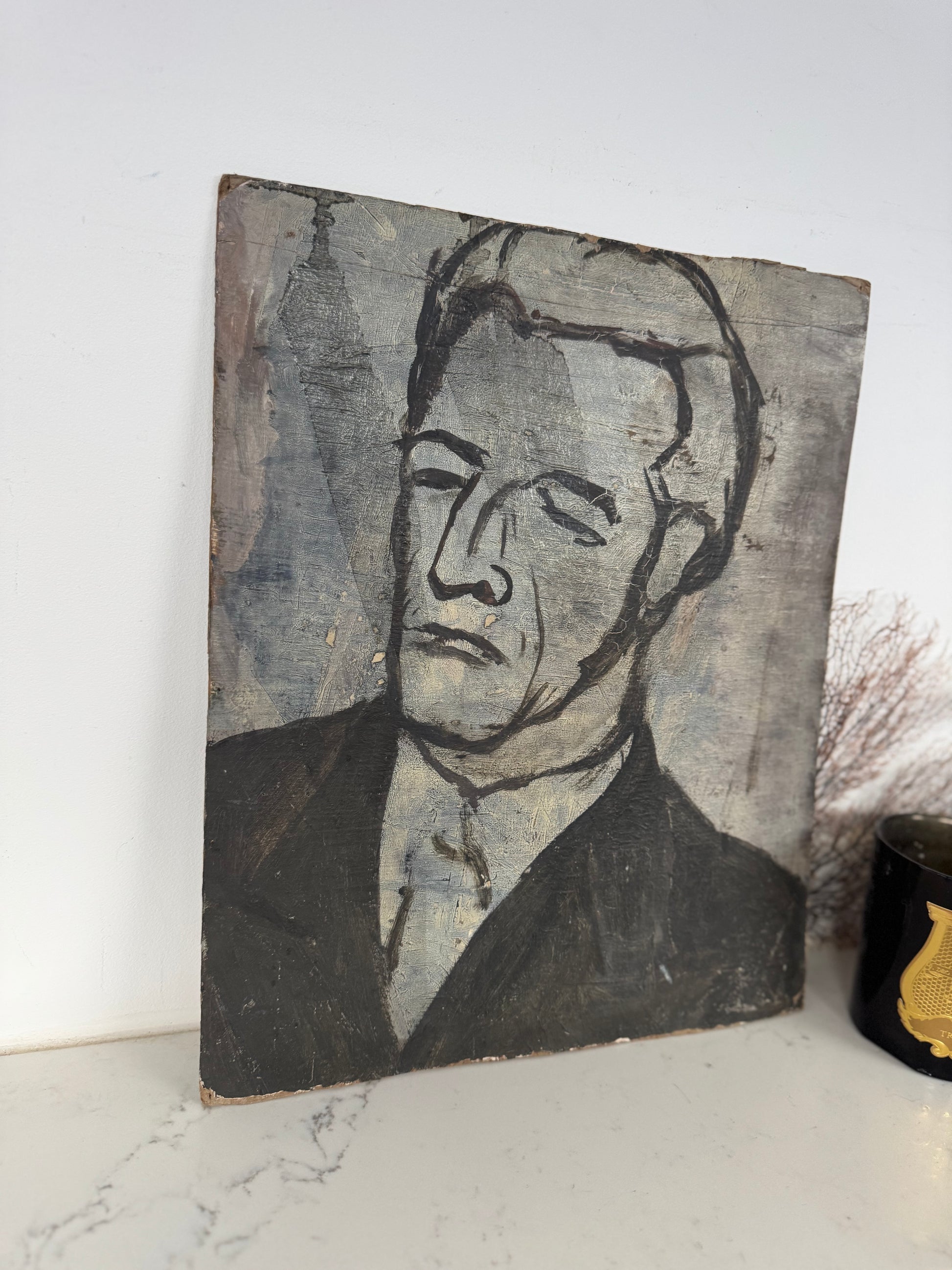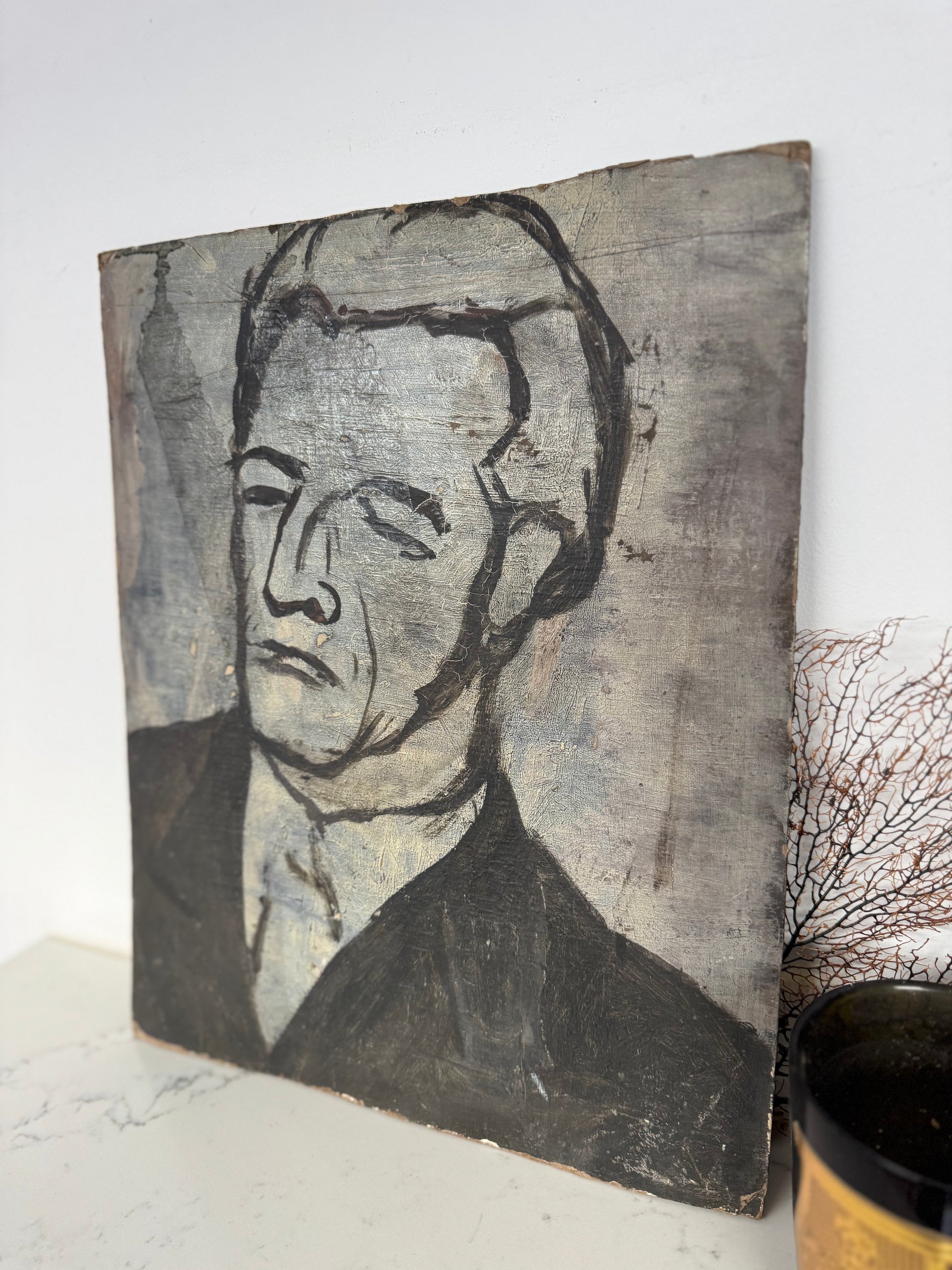 Perfect little painting for a kitchen shelf. Dark & moody colours. On the reverse is a portrait of man, I actually love the portrait but male portrait tend to be marmite!
