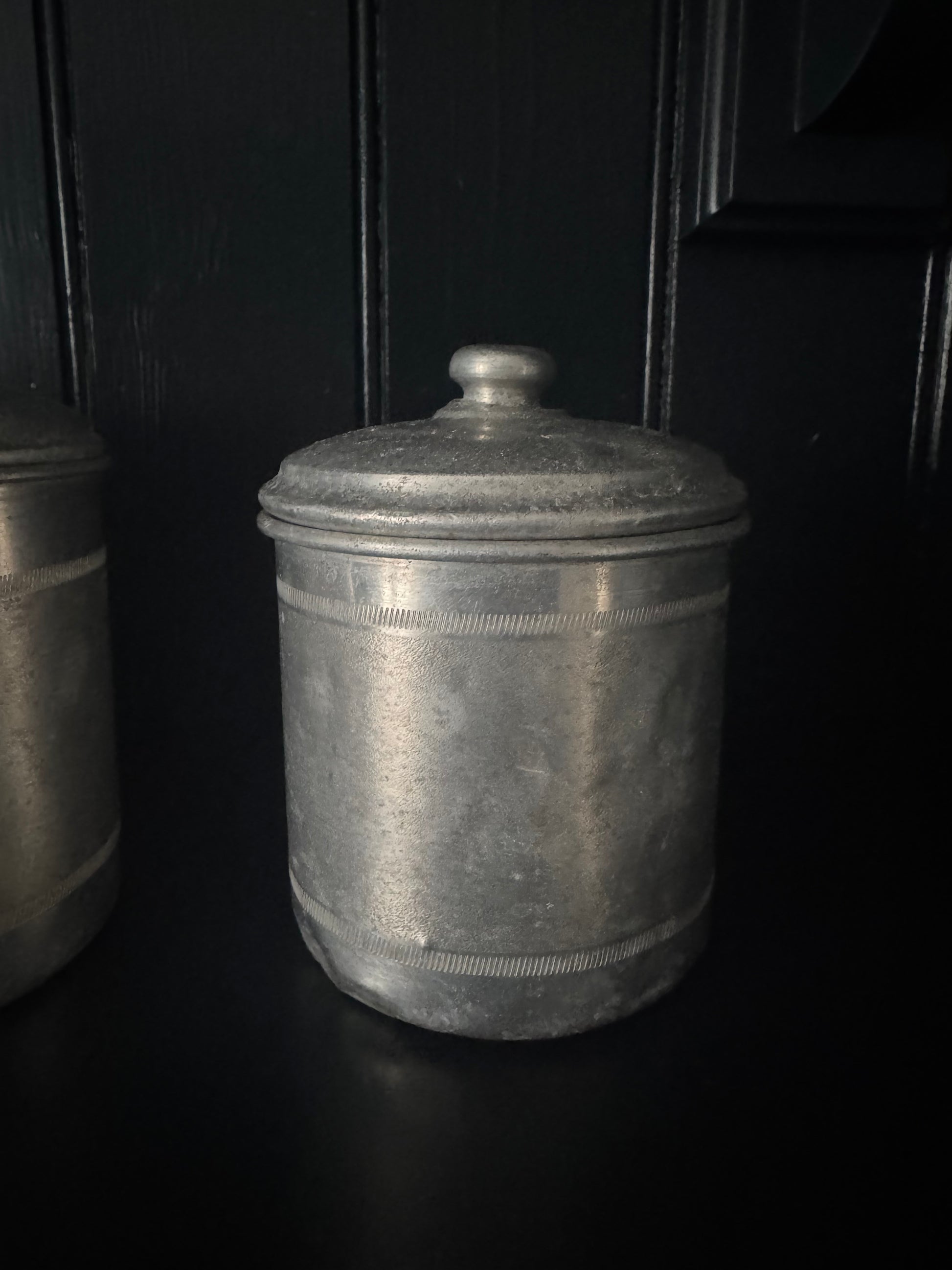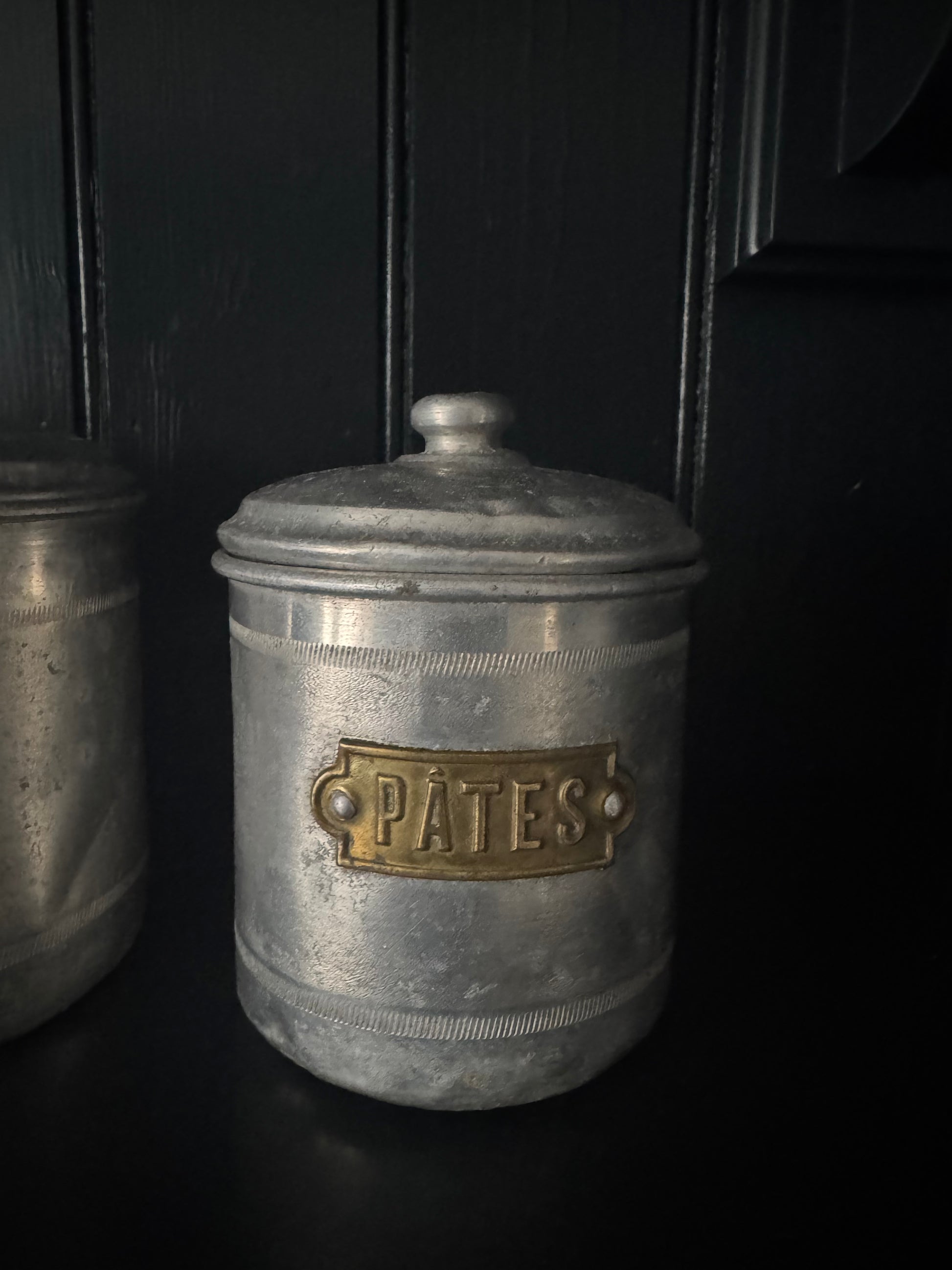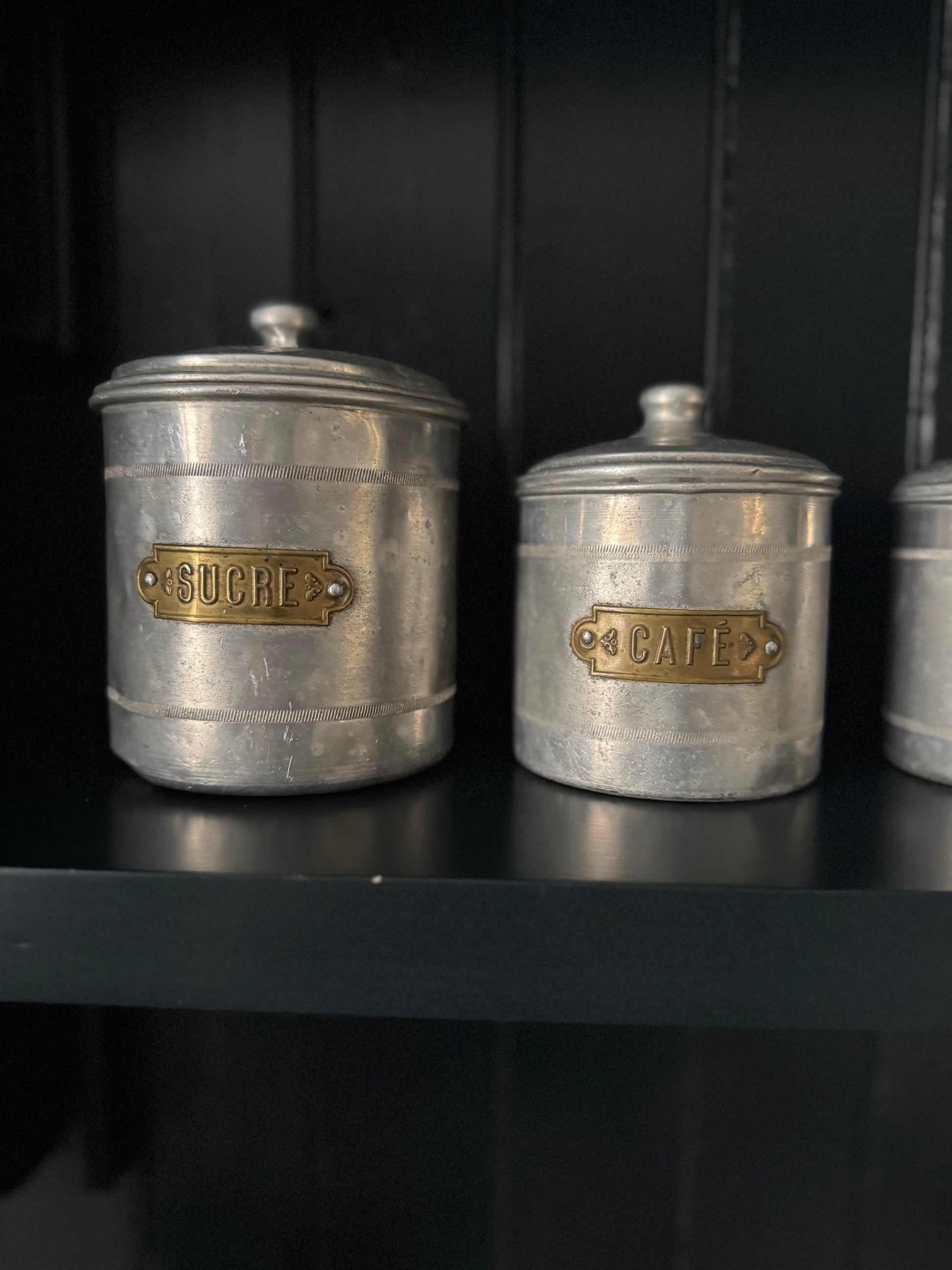 Set of 4 vintage French stacking canisters made from aluminium with brass labels. Look fabulous in a kitchen. Ive become slightly obsessed with these canisters after seeing them in a photo of the most amazing utility room and now I cant resist them!