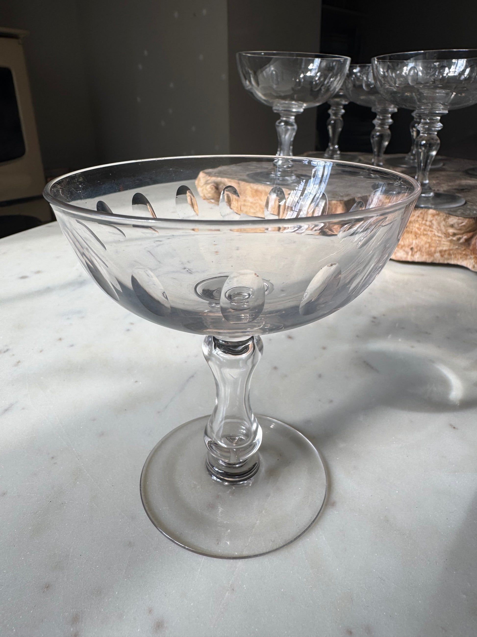 Set of 6 (there are actually 8 but one has a small rim chip & another is a little smaller than others, so you get 8 glasses for the price of 6!) vintage French champagne coupes.