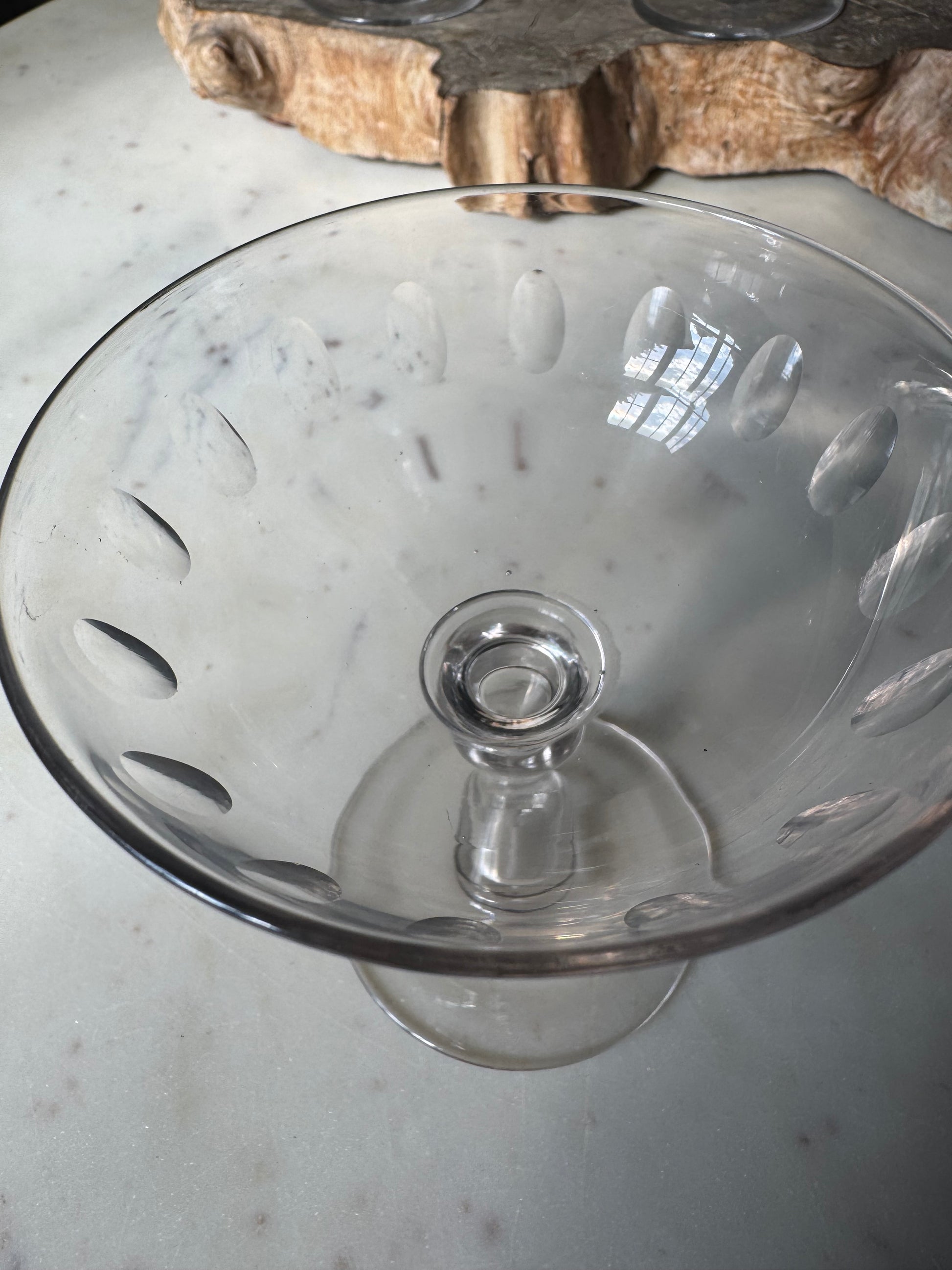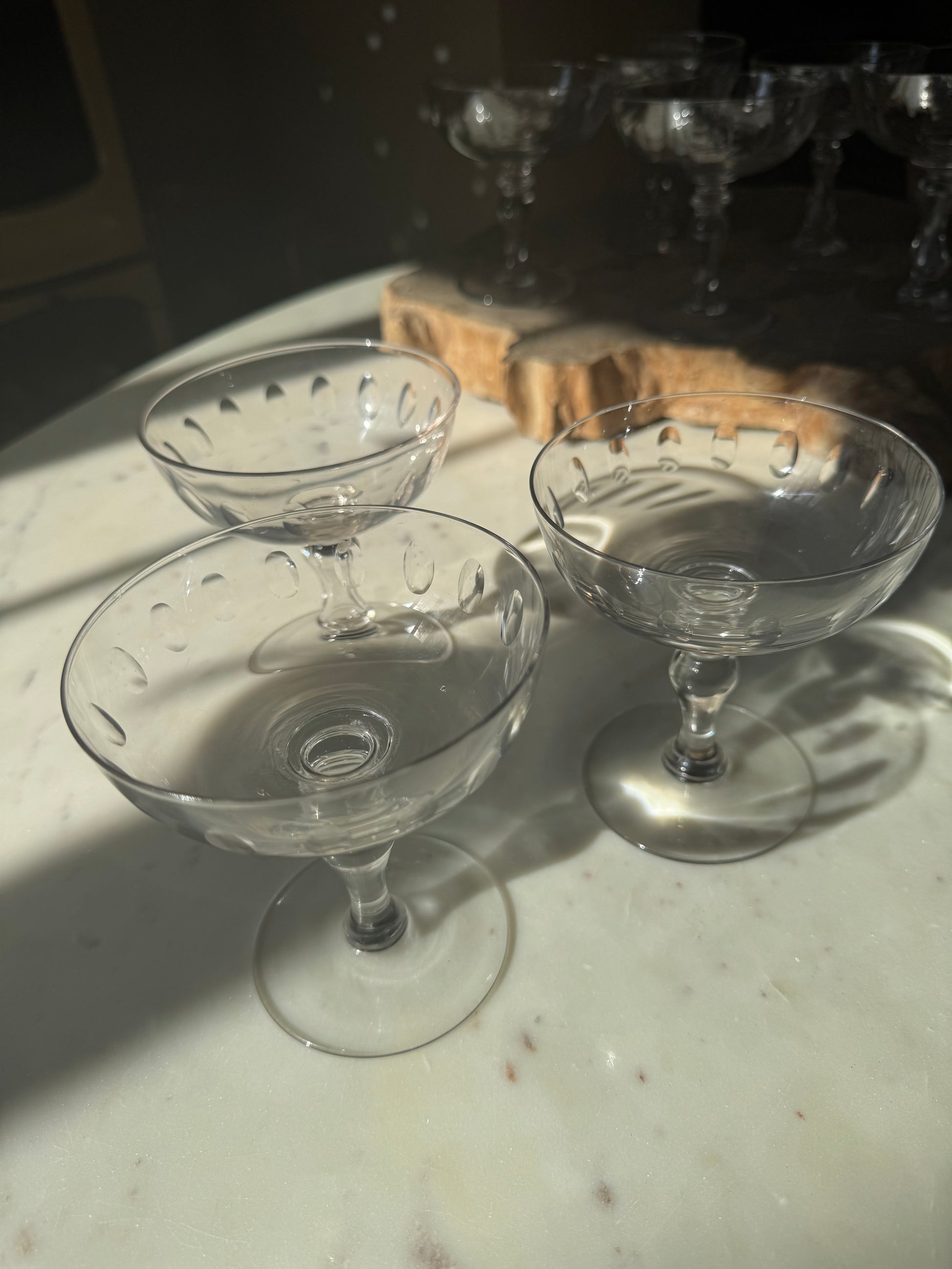 These handblown glasses are a classic design with the sliced decoration around glass. As they are handblown there are bubbles and imperfections in the glass which only add to their loveliness as far as Im concerned. Champagne in my humble opinion tastes better out of a coupe.