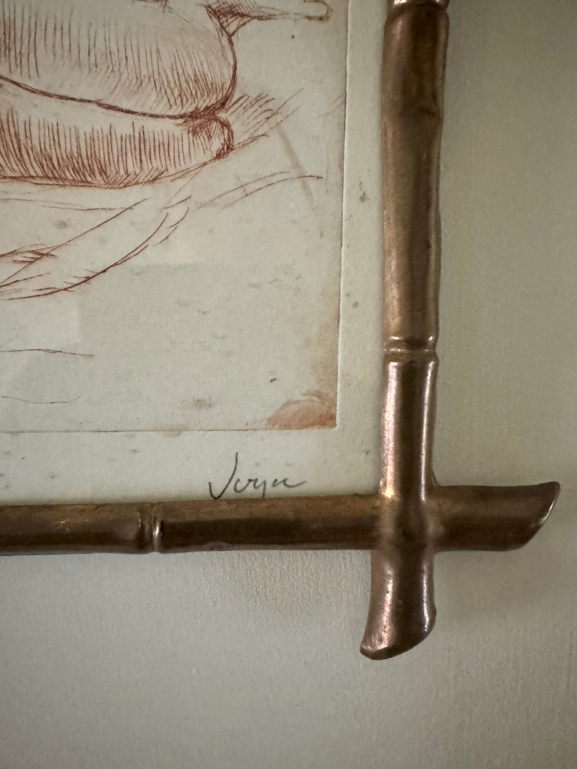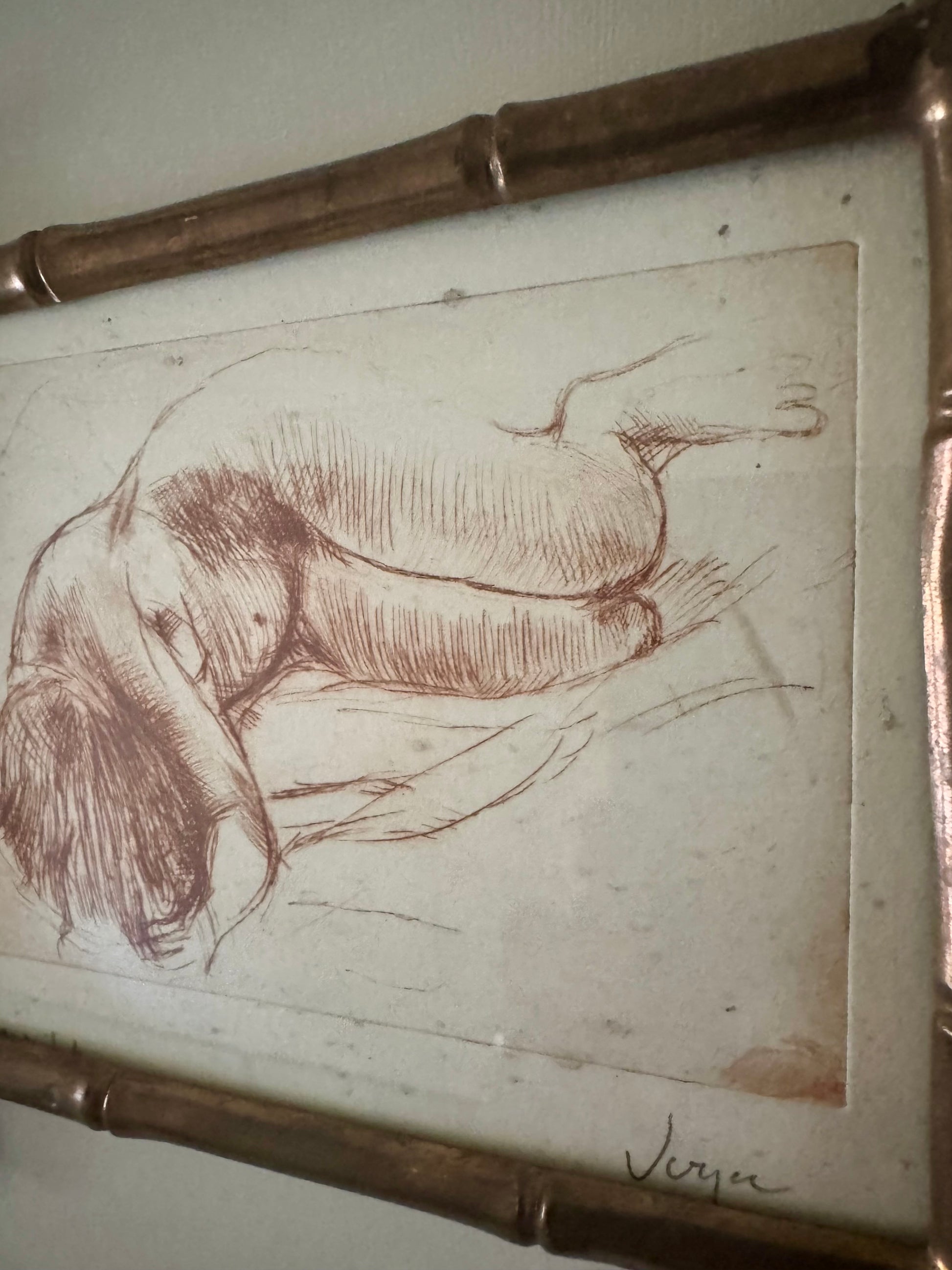 Small Vintage Nude Dry Point Print In French Faux Bamboo Brass Frame
