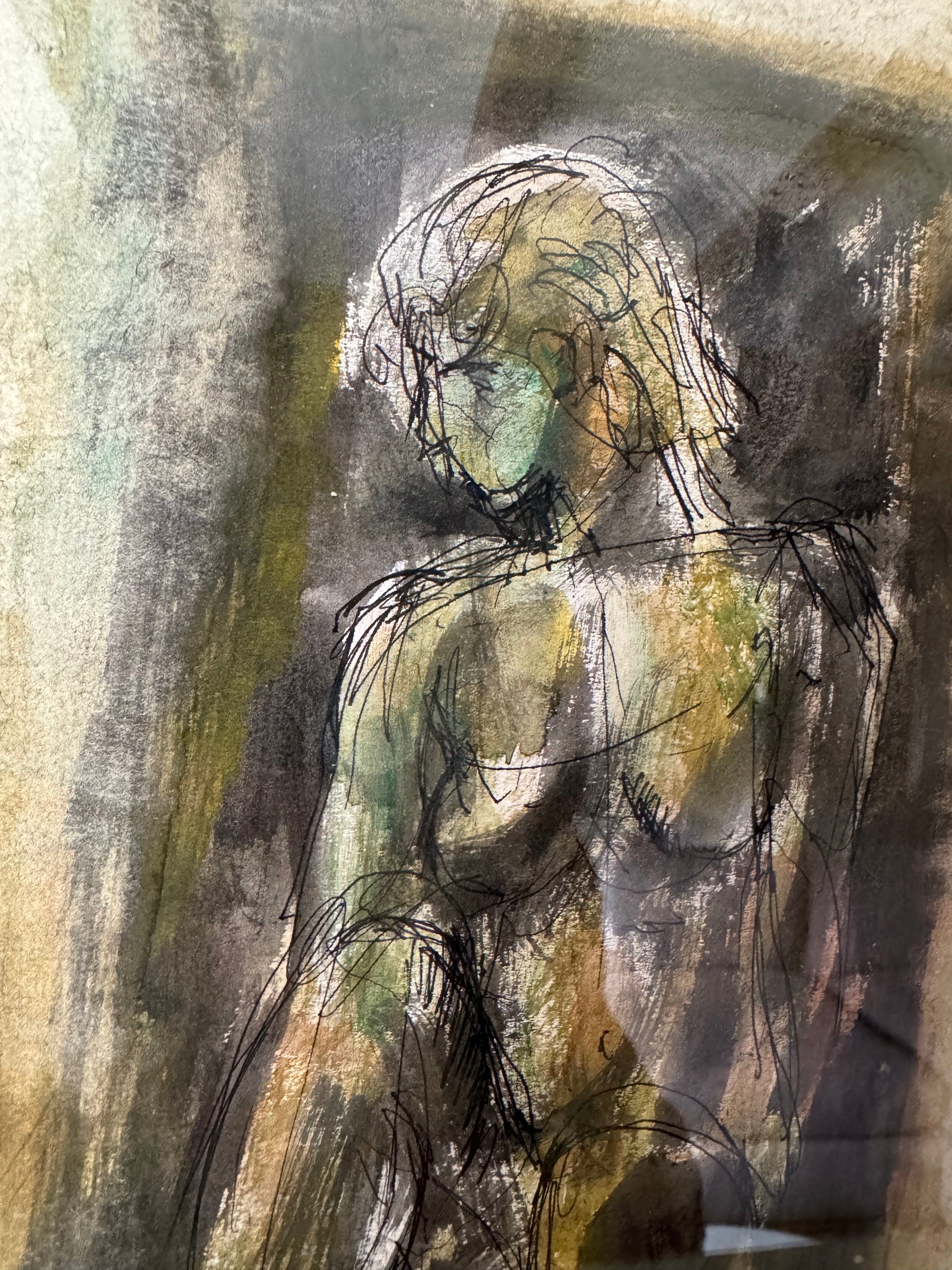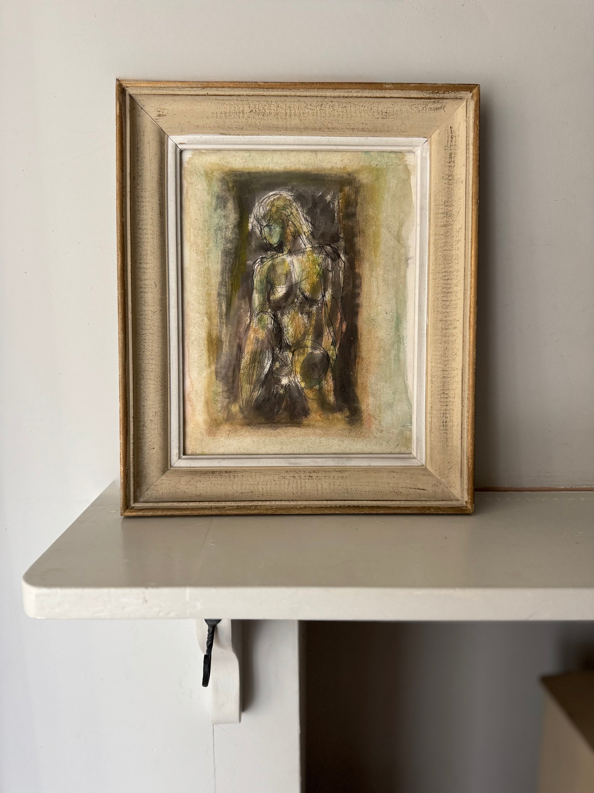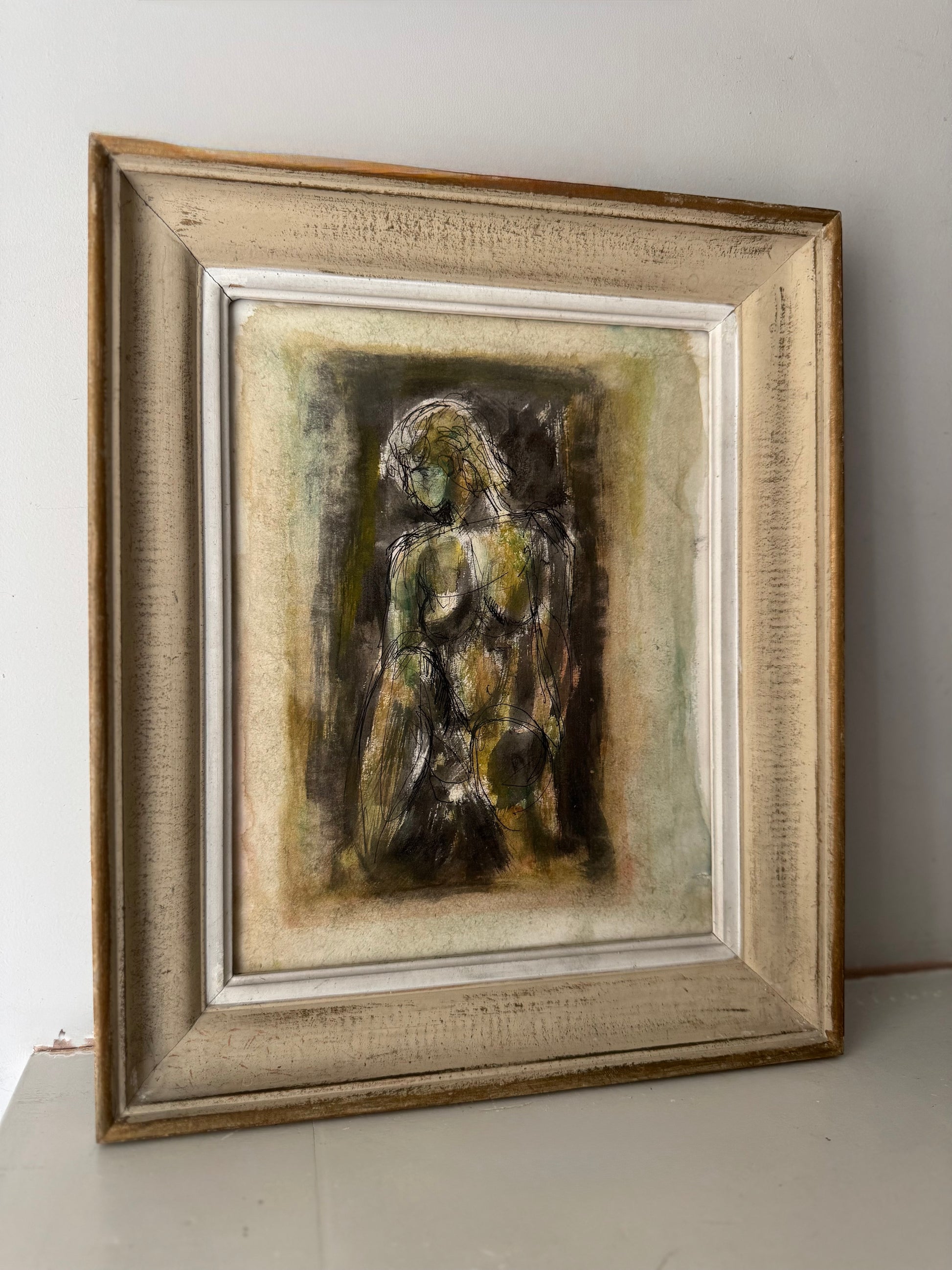 Striking pen & watercolour on paper by Stanley Joyce framed in a vintage French frame. Stunning moody muted greens and expressive mark making.