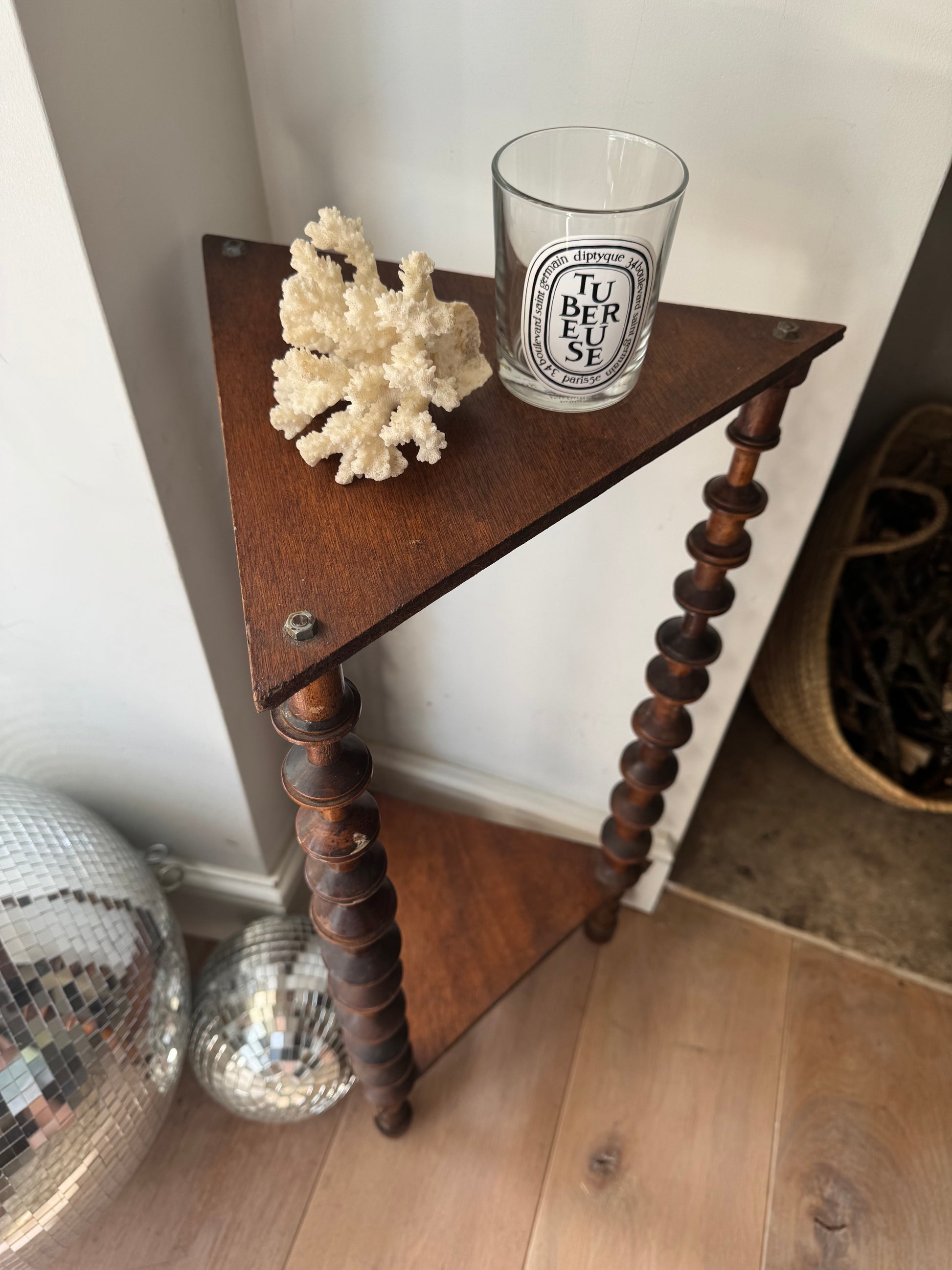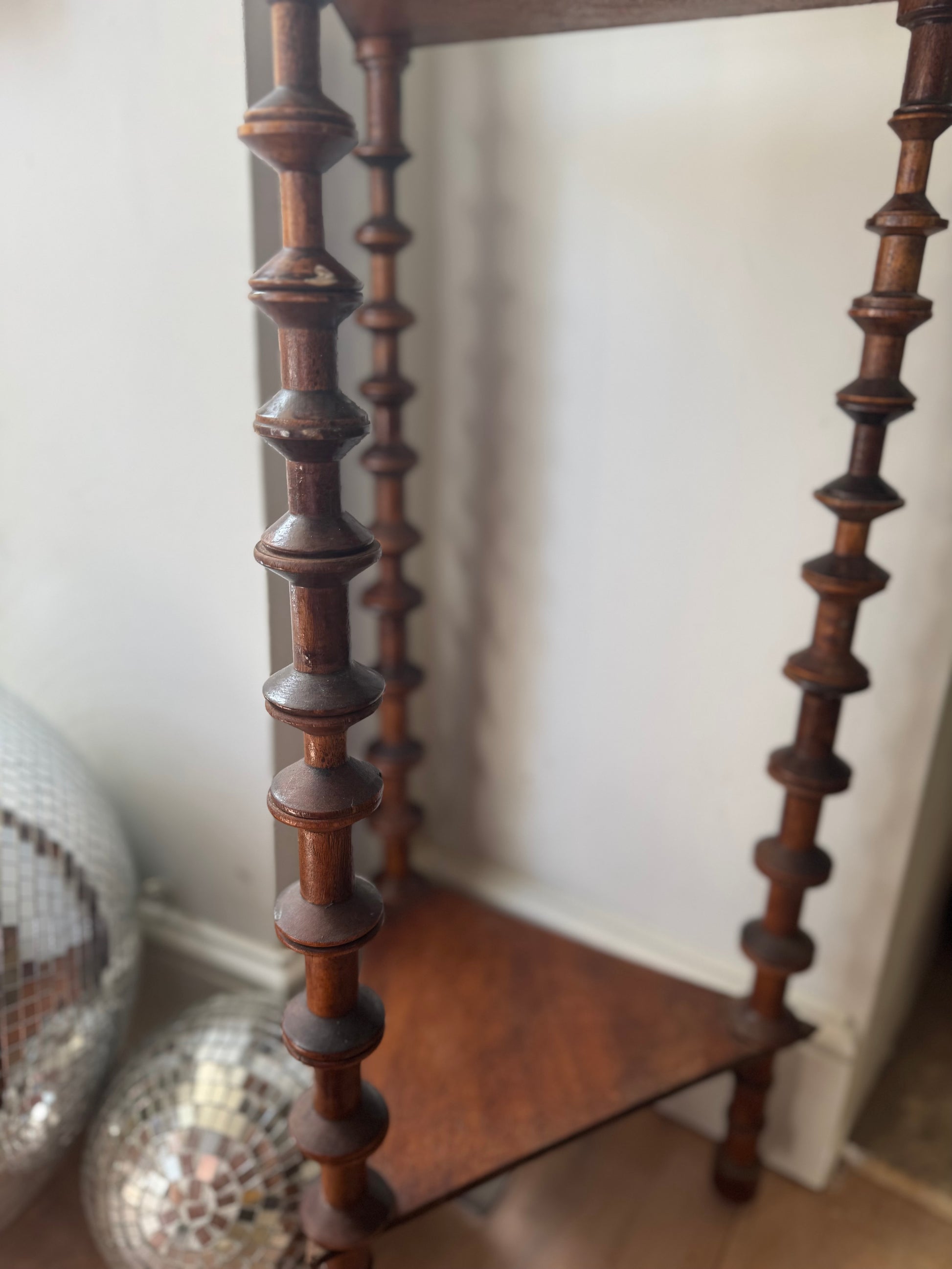 A French folk art bobbin spool triangular 2 tier side table.
