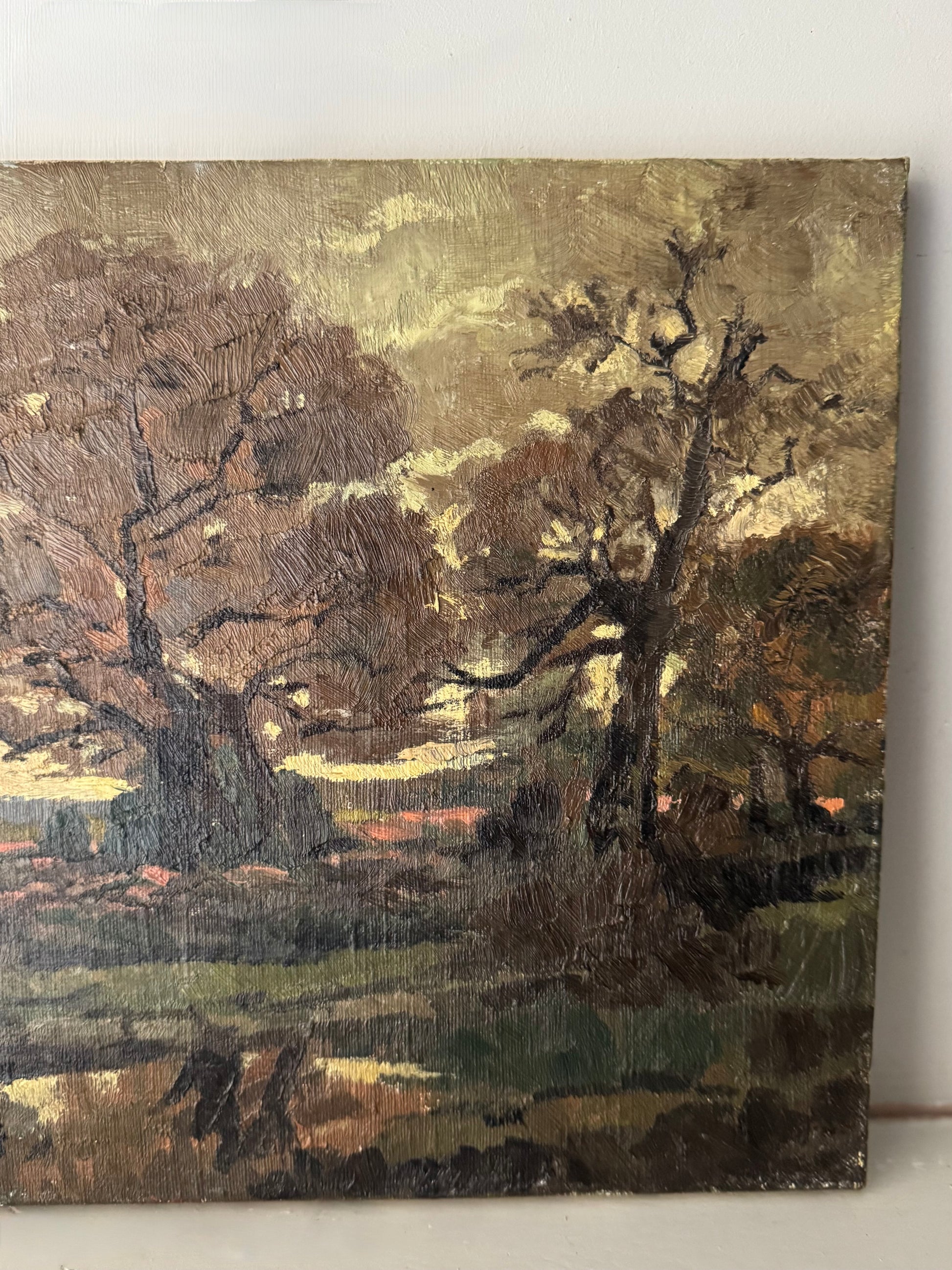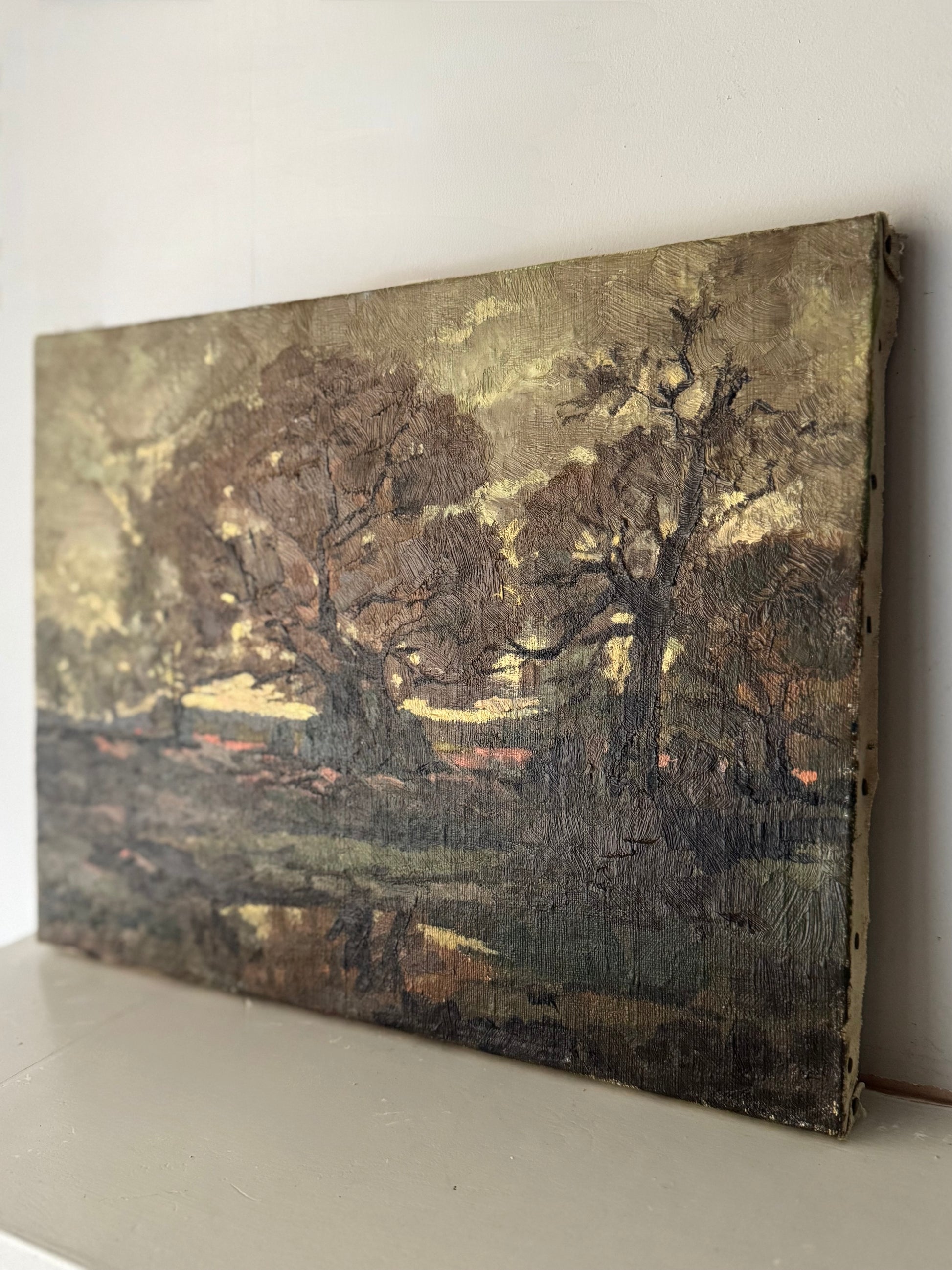 Beautiful vintage French moody landscape painting. Oil on canvas. Love the touches of pink in this dark and moody landscape.
