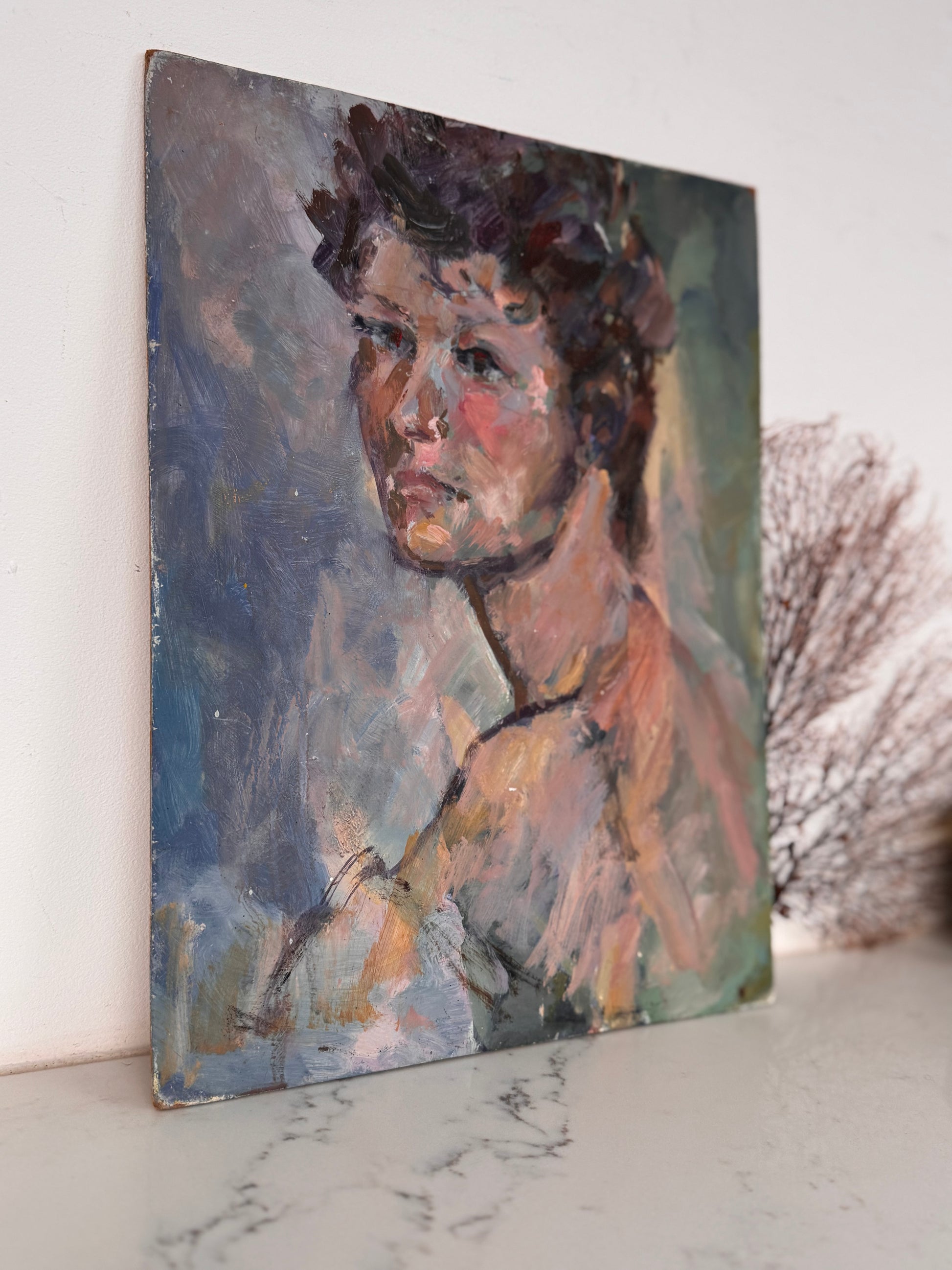 Vintage portrait of a young male acrylic on board. Beautifully painted in expressive strokes and colours..